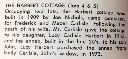 “The Harbert Cottage . . . Occupying two lots, the Harbert Cottage was built in 1909 by Joe Nichols, camp caretaker, for Frederick and Mabel Carlisle. Following the death of his wife, Mr. Carlisle gave the cottage to his daughter, Lucy Carlisle Harbert in 1943, and the annex, built in the late 20’s, to his son John. Lucy Harbert purchased the annex from Emily Carlisle, John’s widow, in 1973.”