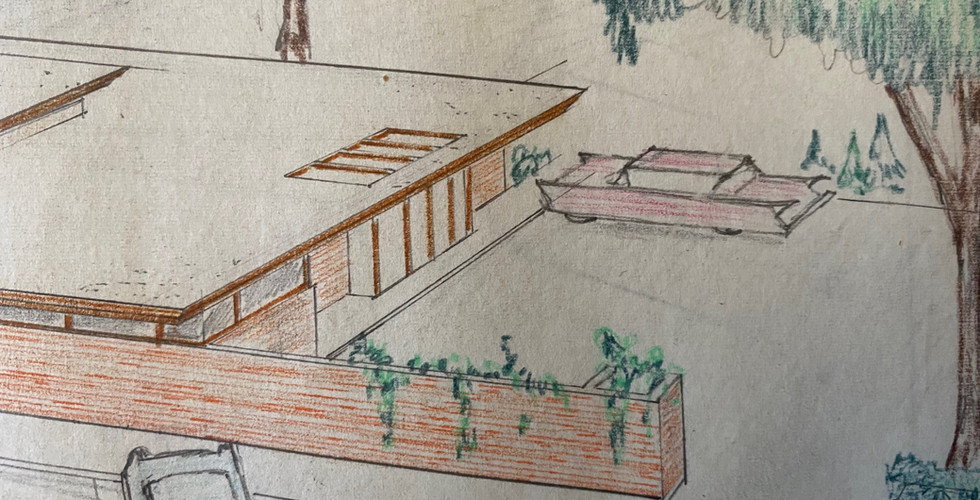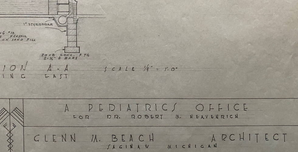 Below you will find images of drawings for an office building Beach designed in 1956 for Dr. Robert Heavenrich. Although the finished building clearly resembles the concept drawings, chimneys and windows are subtly refined. And, in the finished building, a dramatic entrance canopy welcomes patients and guides them to the entrance. (While the entrance canopy has been removed, the office, located at 1107Gratiot, is still clearly recognizable.)